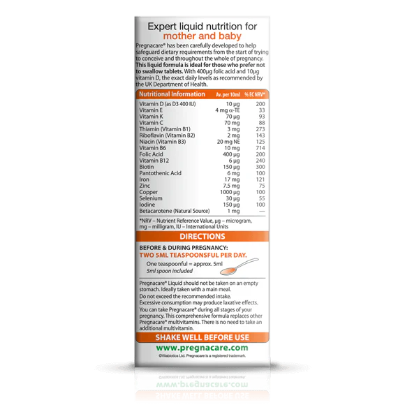 Description: "Vitabiotics Pregnacare Liquid is a specially formulated supplement designed to provide essential nutrients for women during pregnancy. This easy-to-take liquid offers a blend of vitamins and minerals to support overall health and well-being. The 200 ml bottle ensures convenient daily supplementation throughout pregnancy."